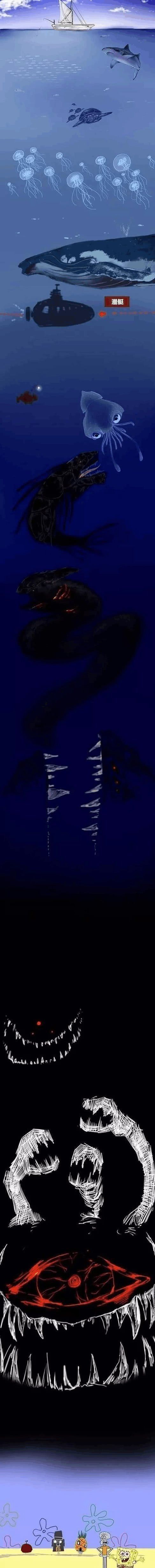 SpongeBob SquarePants is good, and it matches the author's "You know what's under the sea?" "70 Meters underwater is where whale sharks live." "100 Meters underwater is the maximum depth a professional diver can dive without any equipment protection." "200 Meters underwater is the area where giant oarfish live." "1,300 Meters underwater, great white sharks live." "2,000 Meters underwater, there are deep-sea arowanas living." "11,034 Meters underwater, this is the deepest place that humans can explore. Currently, only three people in the world have reached this point." "Everyone thinks that this is the deepest place on the seabed. However, 30,000 meters below the water, there is an underground world called Bikini Castle." I happen to have a picture that matches well.