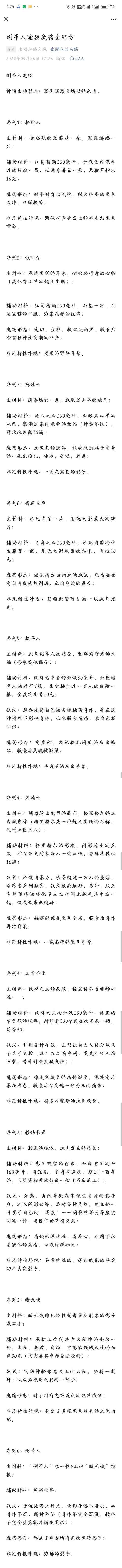 It's just that there are a lot of knives... But it's just right for me, who is a bitch😋If you don't look at some knives in mysterious fandom, there is no mystery at all. There are several reasons for giving a full five-star rating: 1. The original characters are not OOC. The interaction between the original characters and the original characters in the fan fiction has a great impact on the readers' perception. Many fans can't stand it, and the main reason is because the original characters are OOC, such as group pets, harems, and bosses' brainless investments... (I think it's better to watch Su Huan to watch Prince.) The interaction between the protagonist of Shepherd and the original characters is very reasonable. Although the setting is a handsome guy who makes people and gods angry (Aurora will carefully select him), the author did not design any ambiguous plot for this, there is no brainless sudden affection, and there is no investment by a strong man who will extremely tilt resources from the beginning. Even most characters will be biased when they first meet the protagonist because of the secret prayer path. In short, the reactions are very consistent with the image of the original work, and there is no plot to reduce intelligence. The interaction with Klein is also just right. Both parties help each other, respect each other's secrets and ways of doing things, and are not mindlessly revealing to each other. 2. The fighting scenes are well written. Generally speaking, scenes where the protagonist is fighting while reciting prayers can easily make the protagonist feel embarrassed if it is not well written. Just like a hot-blooded boy must call out the name of a move when he makes a move, if it is written well and is hot-blooded, but if it is not written well, it will be a chuunibyou. However, it seems that the author writes very naturally, and completely depicts the mysterious praying man's nagging, sick and crazy fighting state while still being able to exert powerful output. The scene of blood and hula is accompanied by a strange and sacred feeling, combining abstraction and concreteness. Every time I read the combat scenes in this book, I feel a different kind of enjoyment, especially the visuals. Moreover, the repetition rate of the prayers is very low, and the rhetorical level of the prayers is quite high. (Anyway, it's much better than the one in the cuttlefish circle where he was so embarrassed that he dug his toes into the ground and wrote "In the Name of the Father") 3. Very good at using small characters as an entry point. At first, when I saw Lu Ze jump directly to Sequence 5, I thought that what followed would be stories about a high-level mysterious world. This kind of plot is either unpleasant or a bit ungrounded. As a result, the author handled this part very well and created many three-dimensional ordinary characters with character arcs. These different perspectives made the pain Lu Ze carried more concrete and real, making the "fall" of the Hanged Man path not just an empty adjective, but allowing people to feel the heaviness of this path and understand Lu Ze's misery and burden. 4. There are some shortcomings in the combat power design. The protagonist's combat prowess is a bit beyond the standard, and he often fights over and over again. Although it is said that every time you explode, you have to pay a price, but the explosion occurs too frequently. Does it still count as explosion if you often explode? Anyway, it can be a blast, and the side effects are not too high. The reader loses the anxiety about the outcome of the battle. This feeling will be particularly obvious when you watch it in one breath. I understand that it is necessary to have more battles and climax plots to ensure the number of subscriptions, but it is too bland and not enough to attract subscriptions... It should be moderately settled and transitional plots. In addition to fighting and killing, there should be something else! Looking at the current part, it seems that the content of Adam is not high, but it is not certain that it actually contains 99% of the content of Adam. In fact, I hope that the author can have other developments besides "Adam's arrangement" in the future. After all, in the mysterious fandom, Adam is already a brick, and everything can be arranged by him. If you read too much, there will be no surprises. Alas, in fact, after reading the first chapter, I knew that such a good sister was the one who brought the knife, but she was clearly prepared, but why did she hit the knife so hard? My sister is really well-shaped. Cecilia oooooooooooo... -------------------- There are several questions that most people are concerned about before reading Mysterious Fans: 1. Follow the original plot line of Lord of Mysteries? Generally speaking, it goes along. For example, Tingen's time is in Tingen, Backlund's time is in Backlund, and the time in the sea is in the sea. However, the key plot changes are quite big, and the growth lines after Tingen and Kemiao are obviously different. The author is very good at the whole big job. You can read this big job in the part that doesn't require a subscription yet - Huai Zhen who made the child became Lanerwus. 2. Does the protagonist know the plot of Lord of Mysteries? I don't know, but what the big truck crossed is currently suspected to be pickled meat (soul) from the Sea of Chaos. The deeper story has yet to unfold. 3. Relationship with Klein? Friends. As a victim of the cult's sacrifice in Tingen, he was forced to become a secret prayer man and join the Black Thorns. To a certain extent, this was also the church's surveillance and control of the secret prayer man. When Backlund saw Sherlock's advertisement in the newspaper, he guessed that the same time traveler took the initiative to write a test letter. After meeting, he quickly recognized Klein because of the special nature of the sequence path. 4. Have you joined a Tarot Club? Added at t