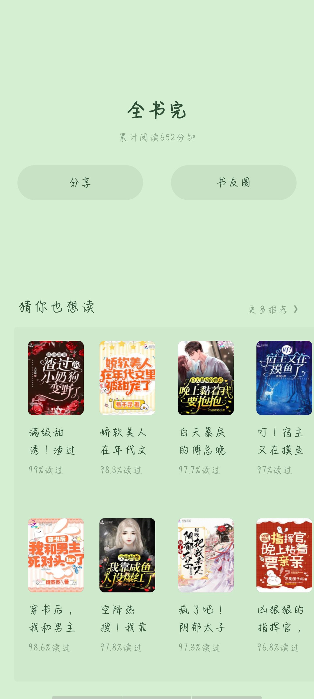 (Belated comment😗hehe) From reading this book to finishing, it took me 50 days and 652 minutes of reading. When I discovered this book, it was already half-written. It was a bit late, but I really liked this book. I finished it yesterday, and I couldn't bear to leave it. This is the first time I read a quick travel story that is not 1v1, and I was surprised to find that there was nothing that made me uncomfortable✋ Li Jinhuan and the domineering boss Gu Zechuan, the yandere junior Jiang Yi, the lion clan young master Shengshi, the eighth prince Lin Qianyu and Su He who has been planning a little wife for a long time, their stories are all very interesting ~ I love them! This is the first time I didn't abandon a book because it was being serialized😷 Although I'm reluctant to part with it, I'm very happy when I think about reading the next book. The next book sounds like a book that I like. I've always liked reading be's fast-travel stories, but there are too few, and many of them are not good to read. I'm really looking forward to it~ I can't wait. I hope the next book will have more readers and more collections and appreciation~! Finally, the flowers are sprinkled🌸🌸🌸🌸🌸🌸🌸🌸🌸🌸✨✨✨✨✨✨✨✨✨✨