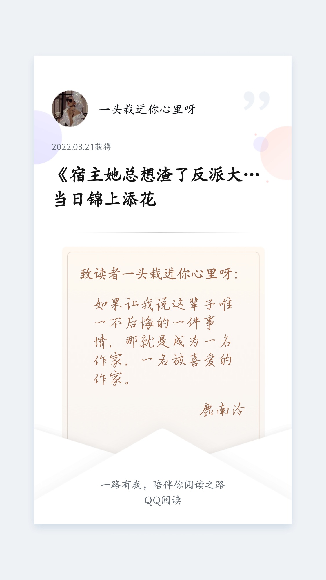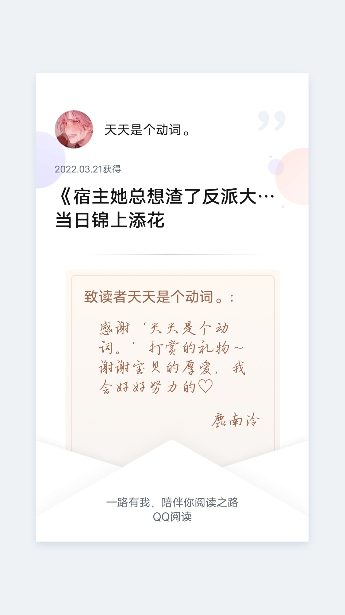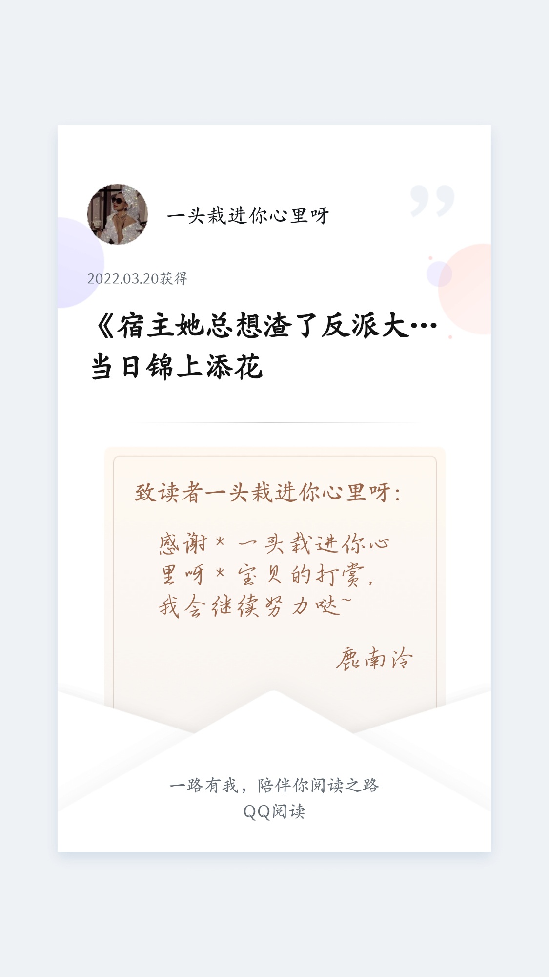Event time: April 2nd 0:00-April 4th 23:55 1. The benefits for the top three in the fan value rankings are as follows: First place, Baroque pearl bracelet + Light of the Road series bookmark gift box (minimum fan value required: 20,000) Second place, Dr. IreanEras Irene fragrance hand cream gift box + Jinque Bailing series bookmark gift box (minimum fan value required is 15,000) Third place, Qiandengyuan stationery gift box set + Rumengzhimeng handbook gift box (minimum fan value required is 10,000) ★The fan value is limited to the top three [during the event]. The fan value of the original book friends is not included in the scope of the activity. The original fan value has been recorded and will be settled after the event. Participants can estimate it by themselves. 2. Floor-trampling activity in the QQ reading book review area (★Reply under this comment. Those who occupy the following floors need to write comments in the book review area [Open a separate book review]. Floors can be occupied repeatedly. Posting content unrelated to this book and this author is prohibited): 33/55/77/99/100 The baby on 33/55/77/99 will be rewarded with a red envelope of 5.20 Yuan, and the baby on the 100th floor will be given a set of Evening Breeze series bookmark gift box. (★Minimum requirements: The comment content is positive, the number of words is ≥500, the content is related to this article, and there is no water comment operation.) 3. For the top three recommendation votes, I will make statistics based on the backstage voting records, one person per number, and there will be no interruption during the event. The winner will receive a red envelope of 6.66 Yuan. (You need to provide voting screenshots during the event, and you will be disqualified if you are interrupted) 4. Book friends with more than 10,000 active points and a long review of more than 500 words will receive a gift box from the Classic of Mountains and Seas series. (7 Activity points = 1 book coin) 5. Monthly pass: October pass - free Little Prince gift box + RNW50g hand cream August ticket - free jelly aromatherapy gift box 6-month pass - free gift box of Thousand Lights Wish Book ★Key points: Book friends who meet Activity 1 (Fan Value) and Activity 5 (Monthly Pass), each person has one account, can only [select one] to receive benefits. Activities 2, 3, 4 and 5 can be repeated ♡Friends who participate in the above activities can join the group, there is no limit at the moment. Winners must provide required screenshots, such as fan value screenshots, recommendation ticket screenshots, ID screenshots, book friend activity points screenshots, and reading time screenshots (reading time, last page of the latest chapter). Spend wisely and don't spend just to attend events^O^ Focus: One person, one number ★Pay attention to activity requirements & mark key points with stars [Guidelines for taking screenshots of fan value: Click on the chapter → Three little dots in the upper right corner → Fan list at the bottom → Overall list → Screenshot your current fan value] ☞The original fan value has been recorded Group: 810827002