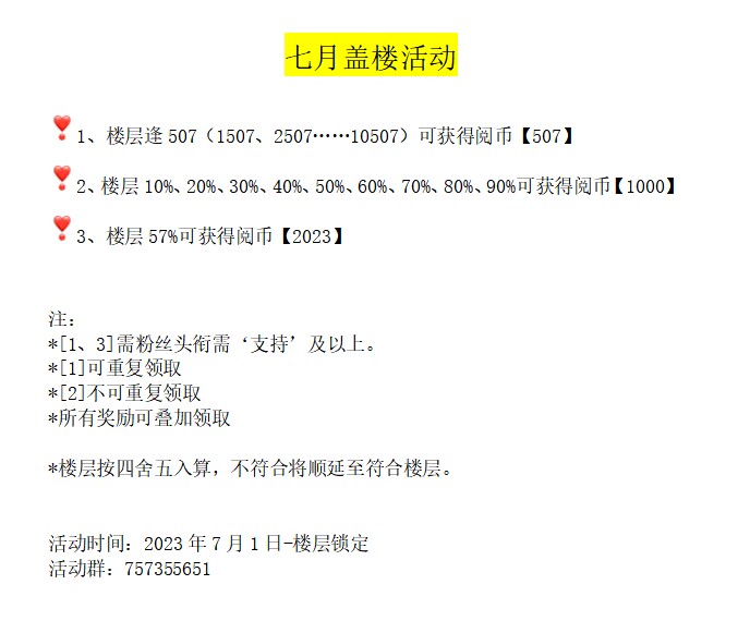 📩 Activity rules: 1. The title format of the book review participating in the activity is [Forbidden Game·6.12 Check-in], the date must be filled in accurately, and the brackets [ ] must be added. If you forget to check in, just skip that day. 2. The book review must be no less than 20 words. Share it in the group before 10 o'clock every day and register it with 77. After 77 has registered, the list of the day will be sent to the group before 22:30. If there are any errors, you can privately chat with 77 before 23:00. If there are any errors, you will not wait. 3. If the content is too off-topic, it may be rejected and not included. Please be informed. 4. Each person can only participate with one account, and multiple accounts are not allowed to participate. 📩 Activity rewards: ✿Complete the check-in for 30 consecutive days, you can get 50 reading coins every day, and you can get 1500 reading coins in total. [Sent after punching in] ✿Complete checking in for 25 consecutive days and you will get 25 reading coins every day, and you can get 750 reading coins in total. [Sent after punching in] ✿If you have clocked in for 20-24 days in total, you can participate in the lottery. Prize pool: Reading coins 500×5 Reading coins 800×1 ✿Consolation Prize All participants who have clocked in for more than 10 days in total will receive 200 reading coins. [Except those who have received the above rewards] 📩 Event time: June 12th to July 11th 📩 Activity group: 615579906