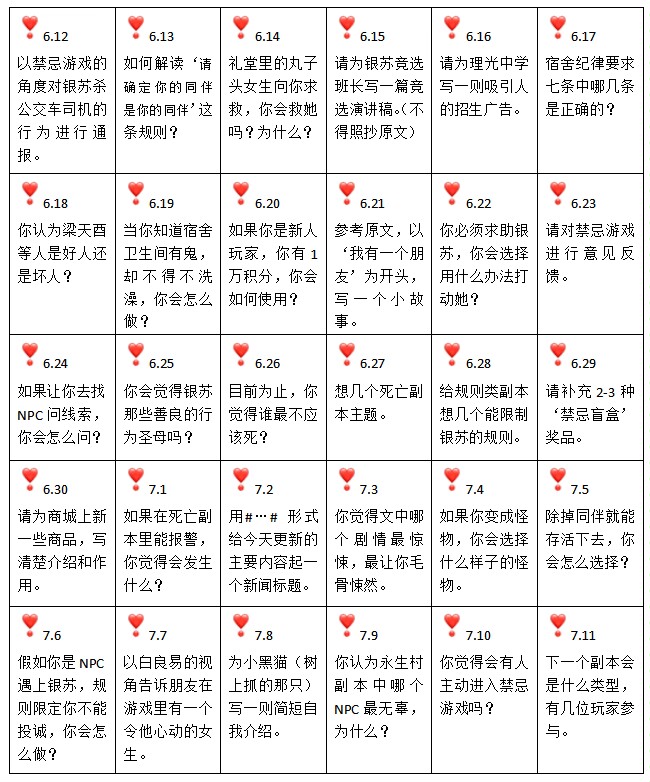 1. Survival is the first rule. 2. Please make sure your companion is your companion. 3. Please do not mention the contents of the copy to anyone. 4. Please try to follow common sense. (The common daily consensus of society on the same thing) 5. After the player dies, only one taboo rule will be generated. If ≥1 person discovers it or no one discovers it for more than 60 minutes, the taboo rule will disappear. (Players need to explore by themselves whether the taboo is correct) 6. Hell can come at any time.