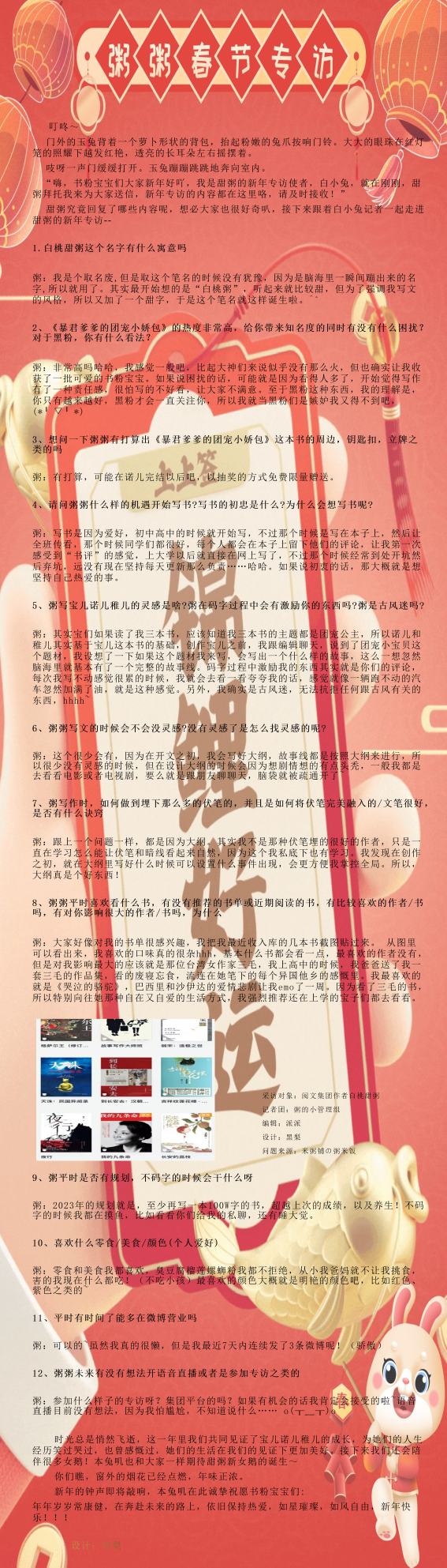 DdOur lovely babies, this is the little nest of Bai Tao Tian Porridge's daughter. While maintaining the popularity of the book circle, you must also abide by the following rules➡️ ⚠️Do not post irrelevant pictures of irrelevant characters, do not mention irrelevant authors and irrelevant works, and it is forbidden to ask for articles or insult the author, which will lead to blackmail! 🈲The author's works are prohibited from secondary creation and private publication! 🉑 Dear friends who are often online and active, please check in to vote and leave messages, complete all tasks with full attendance, and encourage long comments, character analysis posts, small theaters, etc. However, you cannot continue to publish chapters, and any posts found will be deleted! 🔒The atmosphere of the book review area must be maintained by everyone. If there are malicious low scores (three stars and below), negative comparisons, excessive reviews, the post will be locked and deleted, and the post will be banned. We hope for your understanding! 🔔Tipping depends on personal wishes. Minors are not encouraged to tip. The author will not be responsible if there is any regret after tipping! 🕔Update time: not fixed, usually after two o'clock in the afternoon, it will be updated on the same day, four updates per day, and more updates will be dropped as time goes by! 📢Skirt: Read the comments 🧣Author: Fubao's white peach sweet porridge Writing a book is not easy, and the delicate little author needs everyone's care. 💖💖💖💖💖💖💖💖