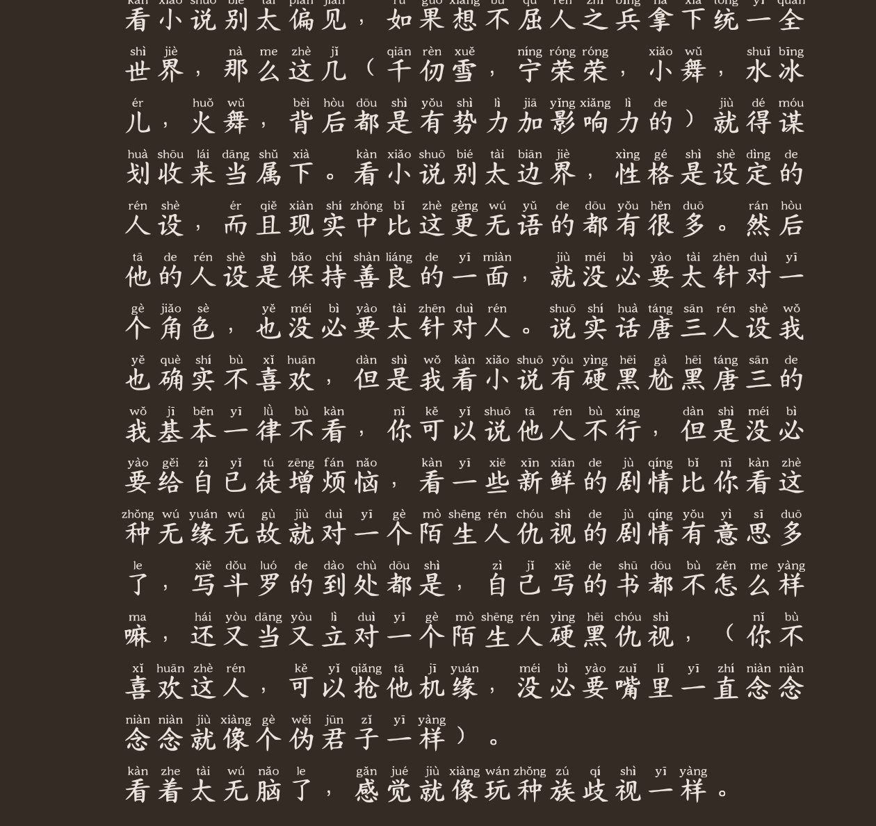 I would rather read a story about licking Tang San than a tough one about embarrassing Tang San. (A rational person is the one who assesses the situation and puts interests first.) I found a few books, but this did not happen in this book , so I finally had the feeling of reading Douluo fan fiction and reading a book. In a word, as long as the plot and dialogue are not poisonous, you can comment on the characters you don't like and their character settings are not lovable, but there is no need to make biased comments that will affect everyone's reading experience. Whatever the content of the original work is, you can just criticize it as unflattering as the content of the original work is. There is no need to distort the facts of the original work to criticize it. I see a lot of authors writing fan fiction. It distorts the content and facts of the original book at the beginning, making it look like a primary school student. Not only does it affect my sanity, it also affects my reading experience. It also seems that my writing has no pattern at all.