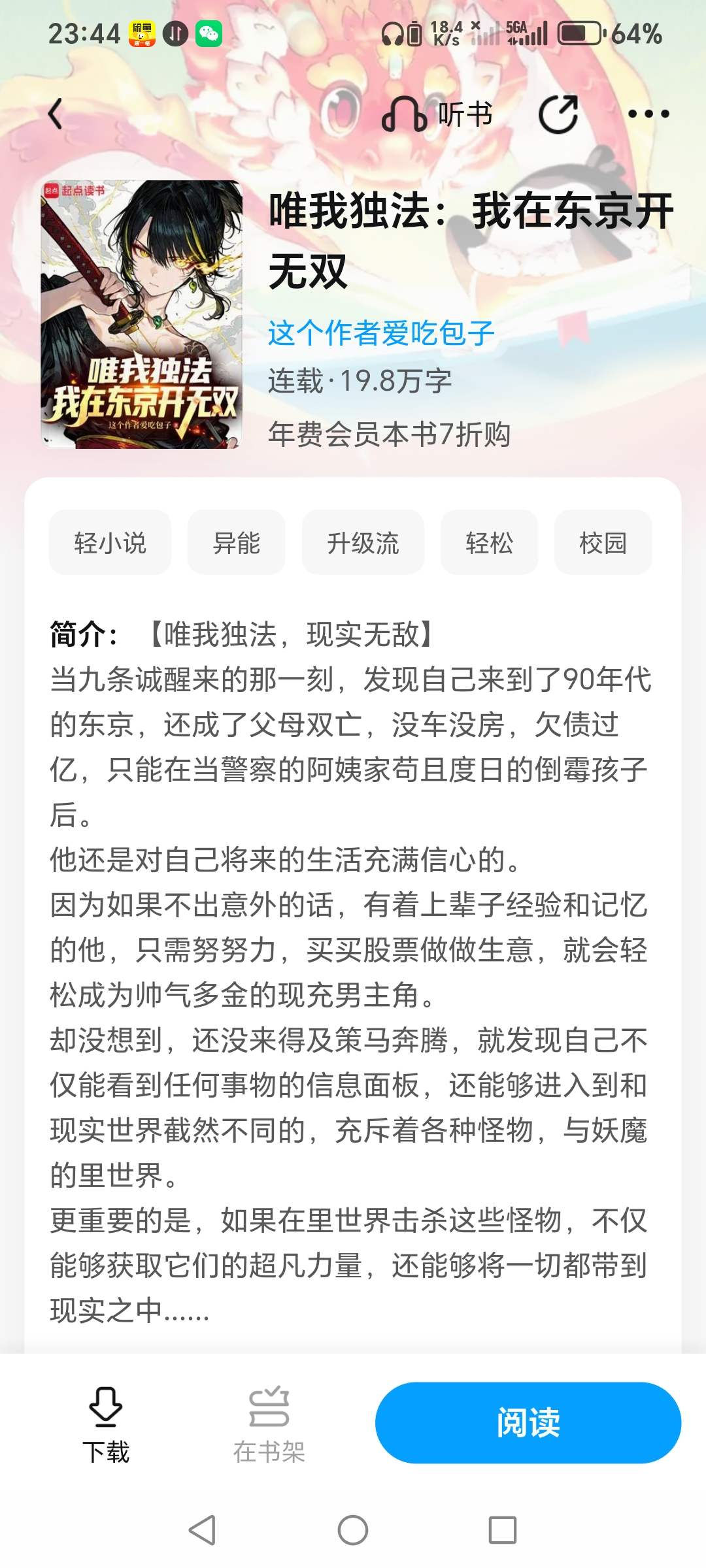 The concentration is too high, making it awkward to watch. For example, the male protagonist, a professional ninja, salutes others during a battle, and then the narration explains that this is a ninja tradition. It is very confusing to watch, and the plot of the cousin taking the male protagonist to 'bet' is very strange to watch; The plot is also pushed to the limit, that is, the villain plans to drug the female protagonist, and the male protagonist happens to know it, and then stops the villain. I feel that this plot is very similar to the previous routine. The villain is going to kill the female protagonist, and the male protagonist appears one second before entering. "Tokyo: My Super Power is updated every week". This is also an invincible article about Tokyo that I can only read. I can read half of this book, but this book by the author is not suitable for me.