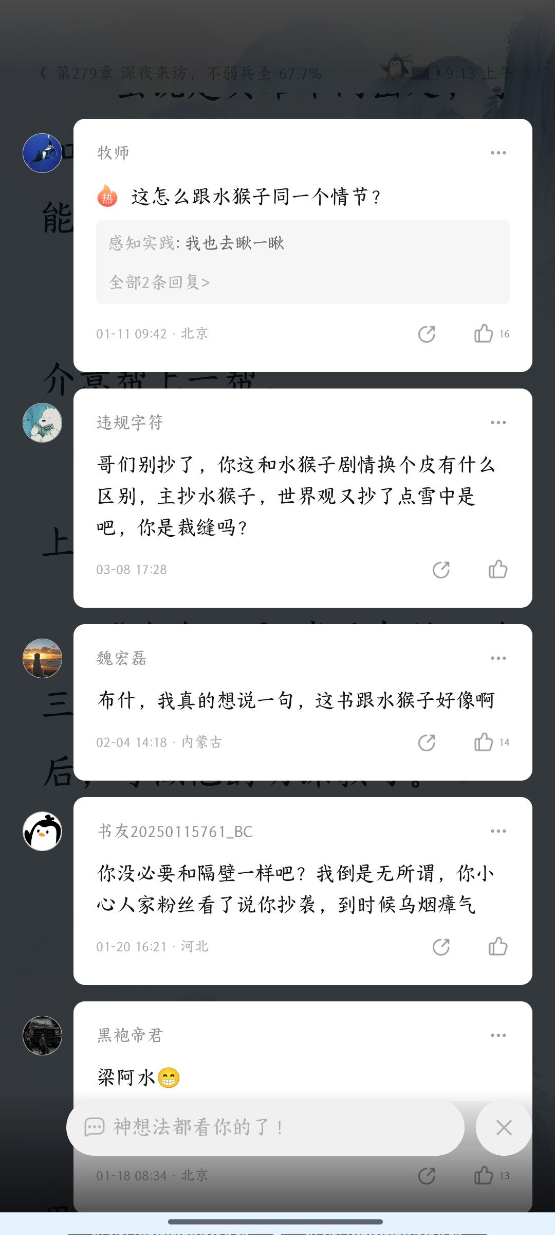 The novel takes "water" as its core and constructs a mythical system based on water ecology. The protagonist Liang Qu travels through time and becomes a fisherman. With the talent of refining water monkeys using the "Cauldron of Water", he gradually controls water beasts, explores fairy islands, and is even worshiped as a god by mortals in temples.